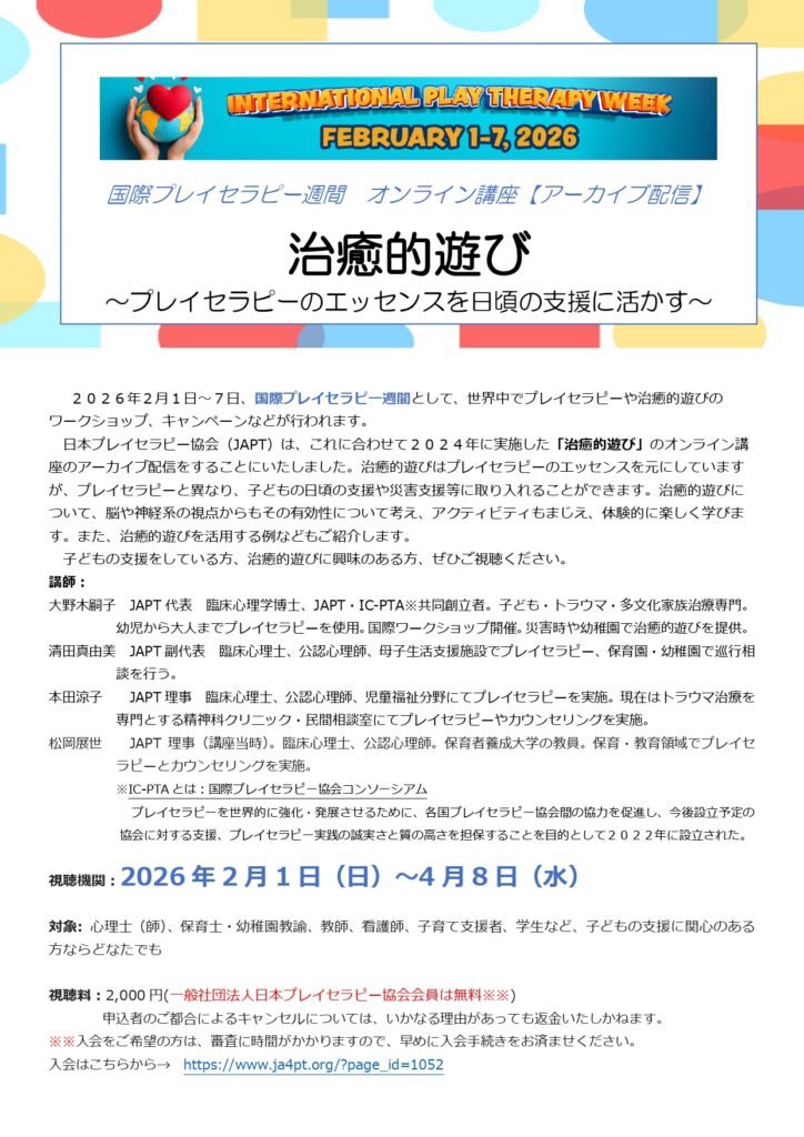 2026年2月1日~7日 、国際プレイセラピー週間として、世界中でプレイセラピーや治癒的遊びのワークショップ、キャンペーンなどが行われます。
